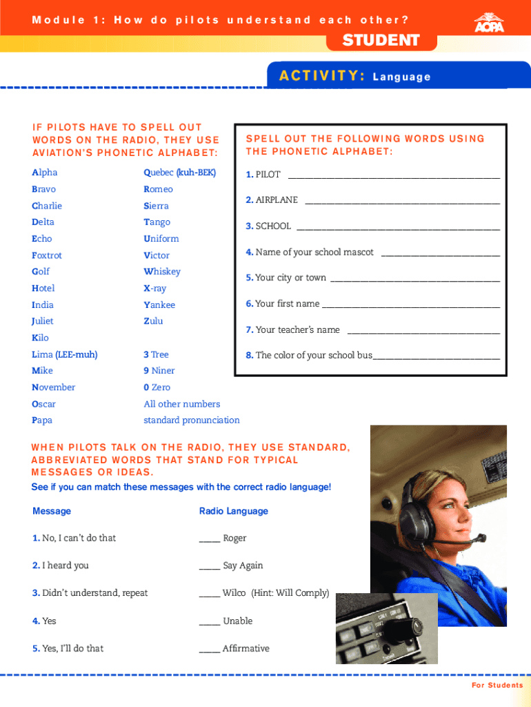 Module 1: How do pilots understand each other?STUDENT ACTIVITY:Language F P I LOT S H AV E TO S P E LL O U T TO R D S O N T H E R A D I O, T H E Y U S E AV I AT I O N S P H O N E T I C A LP H A B