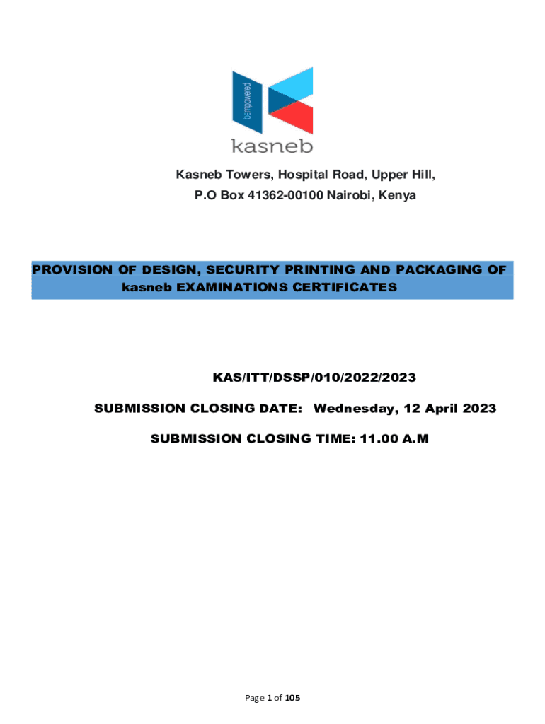P. O Box 4136200100 Nairobi, KenyaPROVISION OF DESIGN, SECURITY PRINTING AND PACKAGING OF