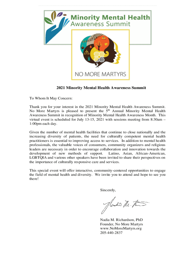 2021 Minority Mental Health Awareness Summit To Whom It May Concern: Thank you for your interest in the 2021 Minority Mental Health Awareness Summit. No More Martyrs is pleased to present the 5th