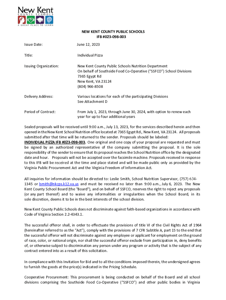 NEW KENT COUNTY PUBLIC SCHOOLS IF #023098003 Issue Date:June 12, 2023Title:Individual PizzaIssuing Organization:New Kent County Public Schools Nutrition Department On behalf of Southside Food Cooperative