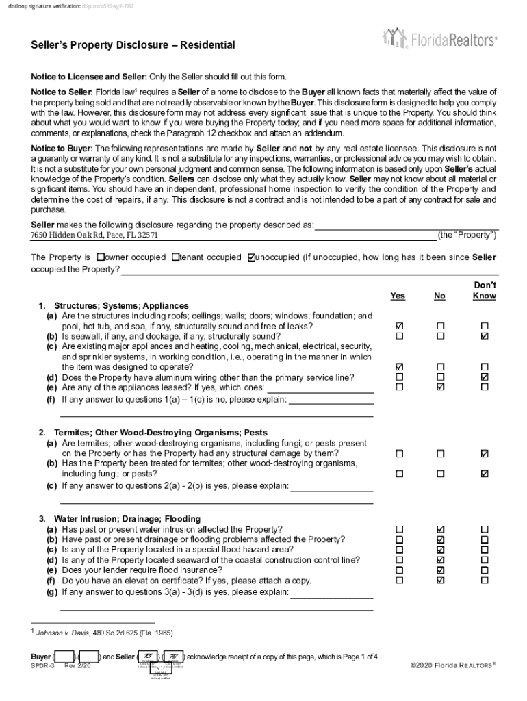 Dot loop signature verification: dtlp.us/a535kgIl7iRZSellers Property Disclosure Residential Notice to Licensee and Seller: Only the Seller should fill out this form. Notice to Seller: Florida law1