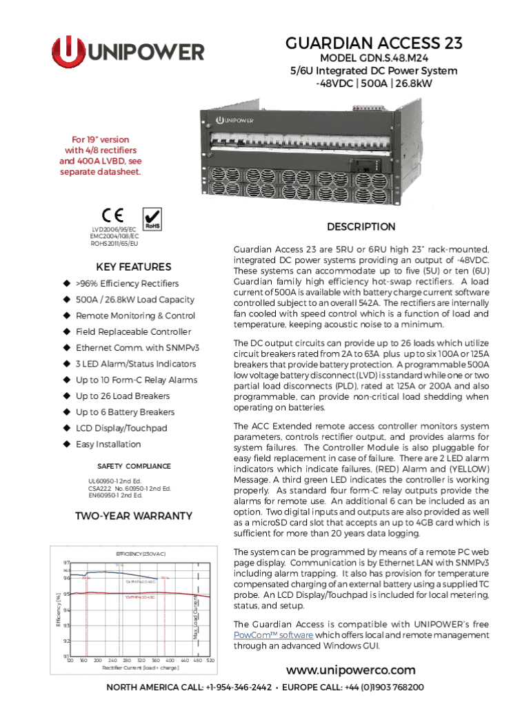 GUARDIAN ACCESS 23 MODEL GDN. S.48. M24 5/6U Integrated DC Power System 48VDC | 500A | 26.8kWFor 19 version with 4/8 rectifiers and 400A LBD, see separate datasheet.DESCRIPTIONLVD2006/95/EC EMC2004/108/EC
