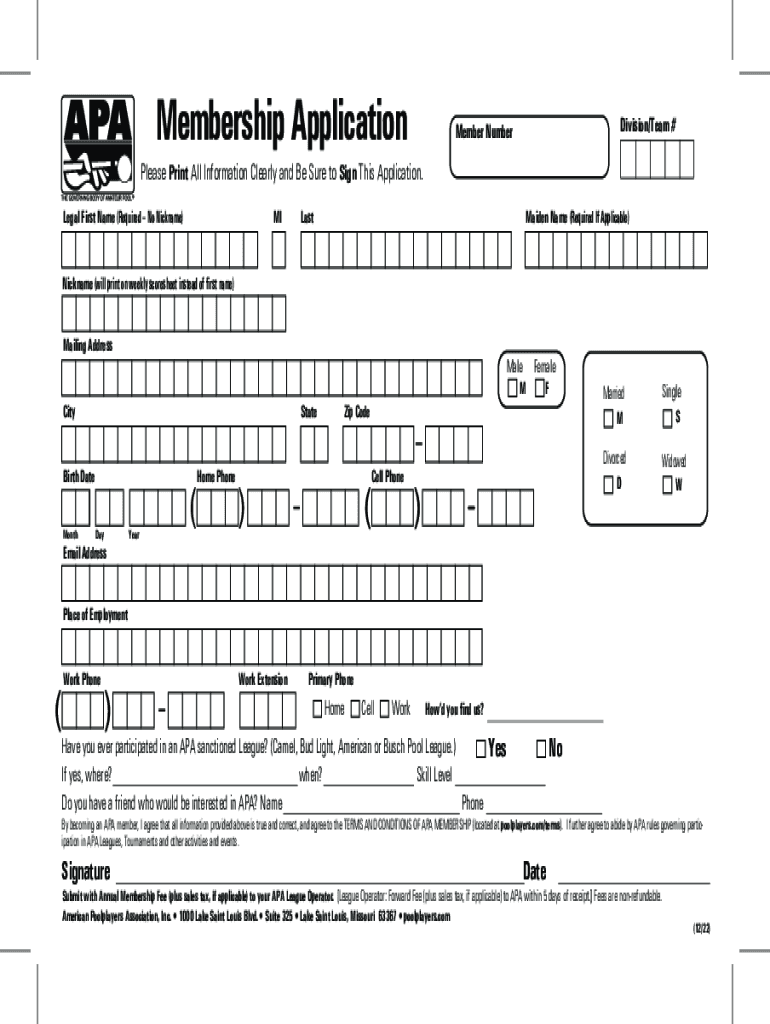 Membership ApplicationDivision/Team #Member Numberless Print All Information Clearly and Be Sure to Sign This Application. Legal First Name (Required No Nickname)Maiden Name (Required If Applicable)LastNickname