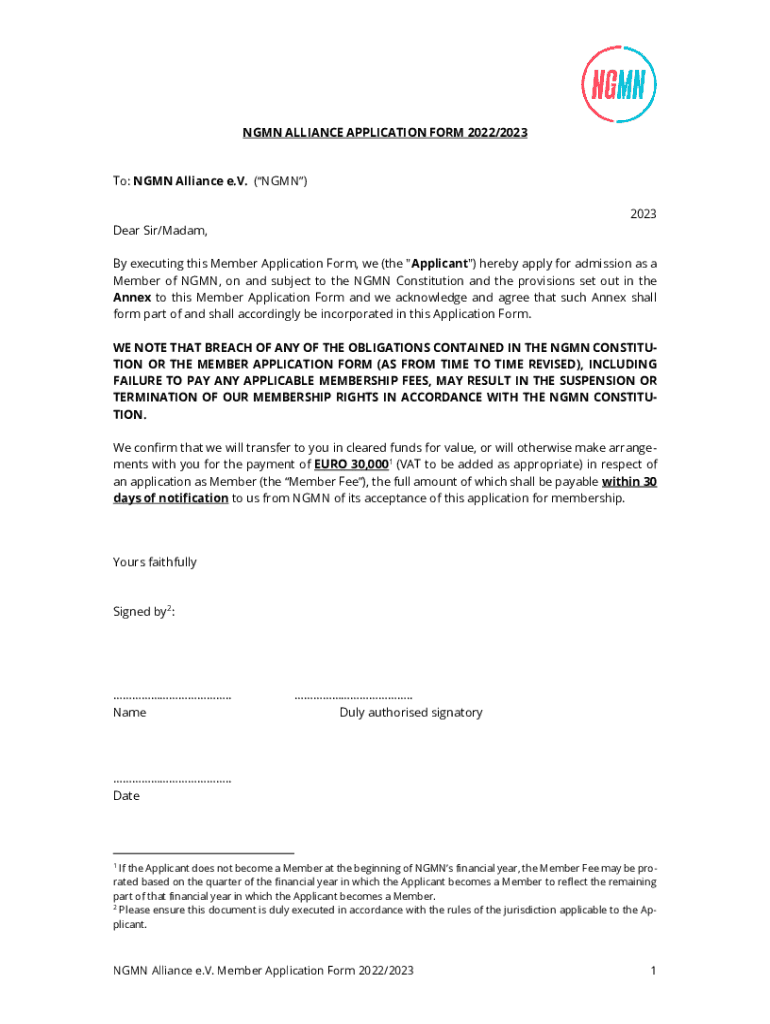 NGN ALLIANCE APPLICATION FORM 2022/2023To: NGN Alliance e.V. (NGN) 2023 Dear Sir/Madam, By executing this Member Application Form, we (the \” Applicant\”) hereby apply for admission as a Member