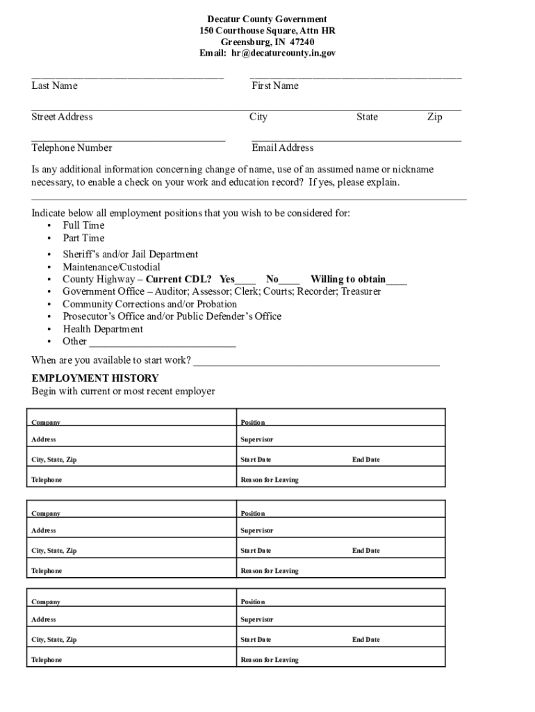 Decatur County Government 150 Courthouse Square, Attn HR Greensburg, IN 47240 Email: hr@decaturcounty.in.gov ______Last NameFirst Name___ Street Address City State Zip ___ Telephone Number___ Email