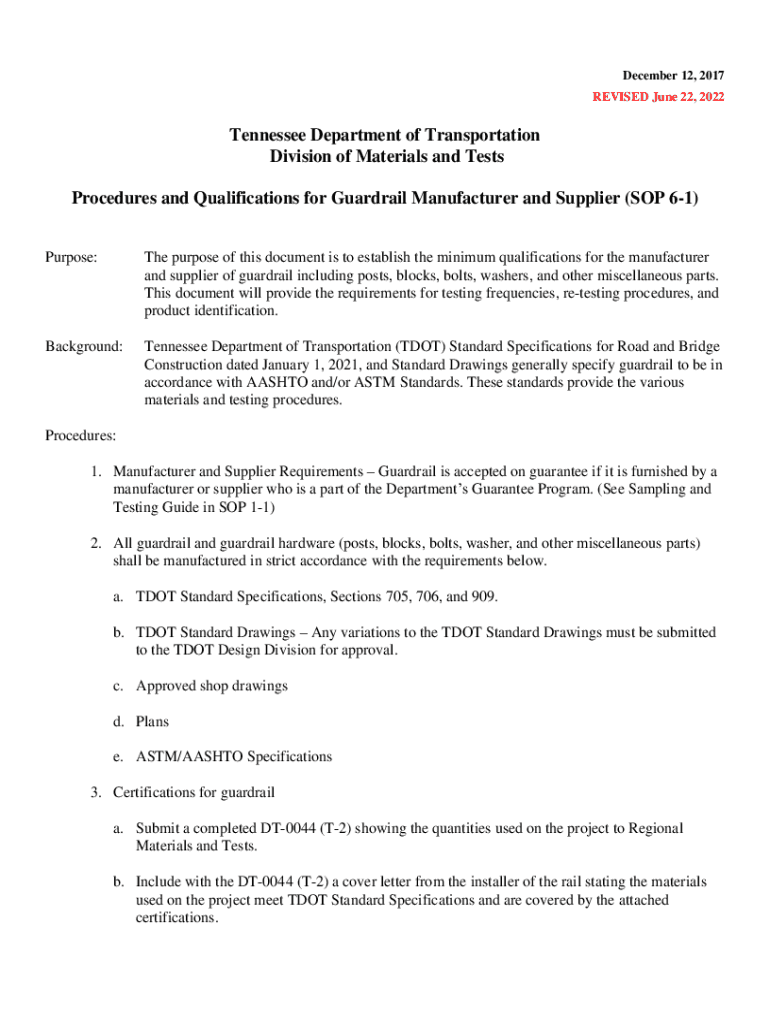 December 12, 2017, REVISED June 22, 2022Tennessee Department of Transportation Division of Materials and Tests Procedures and Qualifications for Guardrail Manufacturer and Supplier (SOP 61) Purpose:The