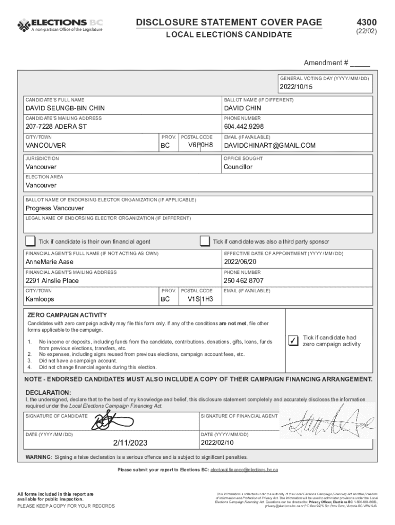 DISCLOSURE STATEMENT COVER PAGE nonpartisan Office of the LegislatureLOCAL ELECTIONS CANDIDATE4300(22/02)Amendment # ___