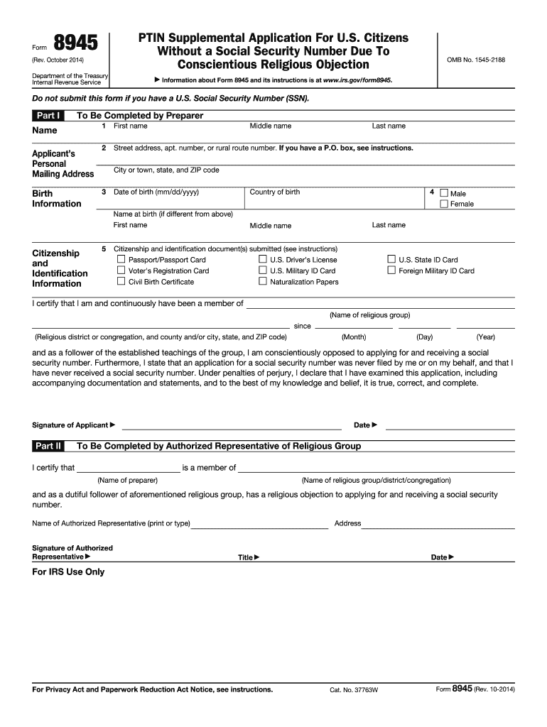 Form 8945 PAIN Supplemental Application For U.S. Citizens Without a Social Security Number Due To Conscientious Religious Objection (Rev. October 2014) Department of the Treasury Internal Revenue