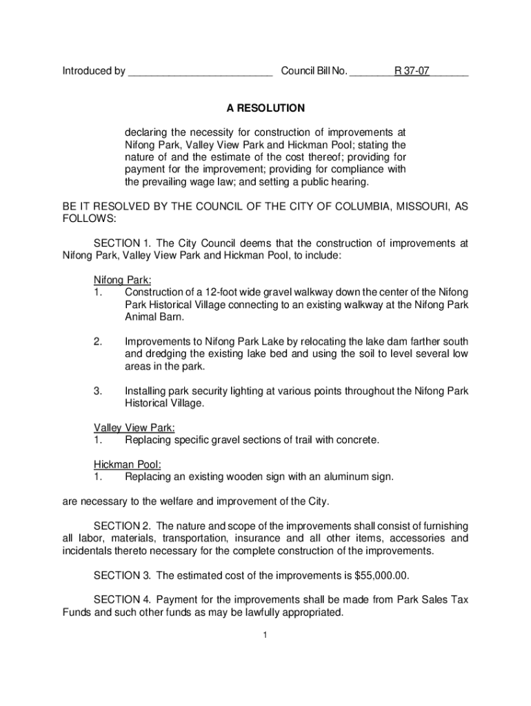 Introduced by ___ Council Bill No. ___R 3707___A RESOLUTION declaring the necessity for construction of improvements at Nixon Park, Valley View Park and Hickman Pool; stating the nature of and the
