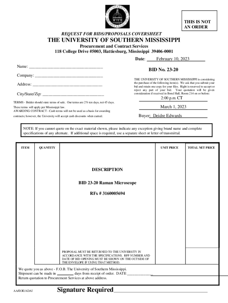 THIS IS NOT AN ORDER REQUEST FOR BIDS/PROPOSALS COVERSHEETTHE UNIVERSITY OF SOUTHERN MISSISSIPPI Procurement and Contract Services 118 College Drive #5003, Hattiesburg, Mississippi 394060001 Date: