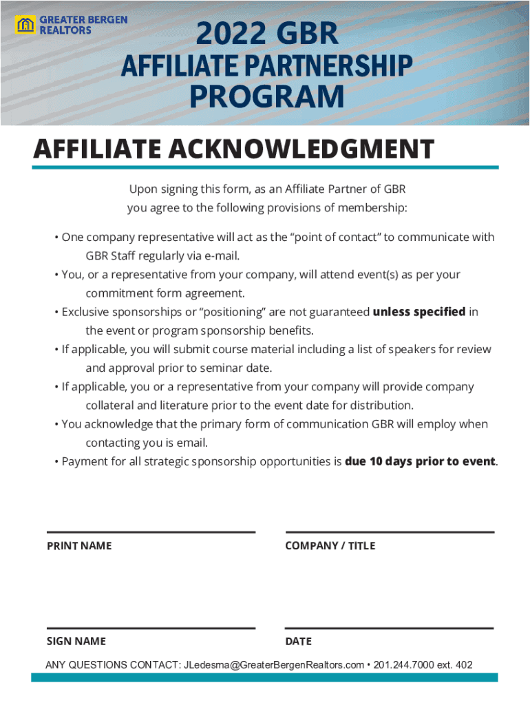 COVER PAGE2022 AFFILIATE PARTNERSHIPPROGRAMWWW.GREATERBERGENREALTORS.COM1WELCOME TO THE 2022 GBR AFFILIATE PARTNERSHIP PROGRAM GBR, a not for profit professional trade association with over 8,800