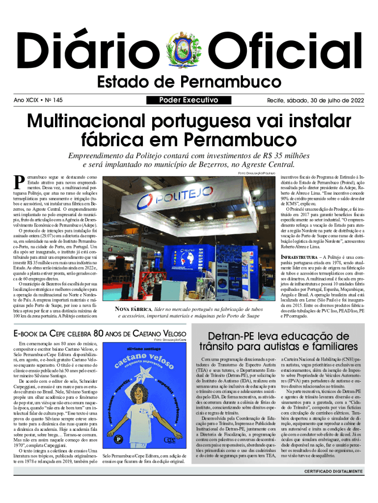 Est ado de Pernambuco XCIX No 145Poder ExecutivoRecife, bad, 30 de Julio de 2022Multinacional Portuguese vie install