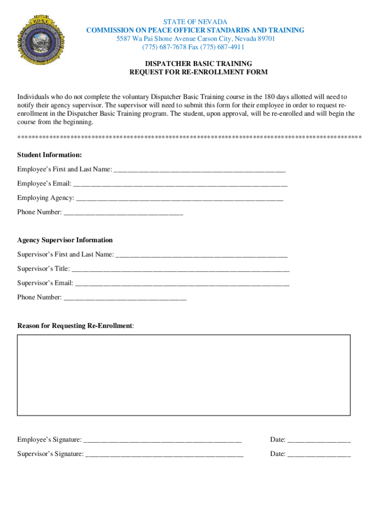 STATE OF NEVADA COMMISSION ON PEACE OFFICER STANDARDS AND TRAINING 5587 Wei Pie Shone Avenue Carson City, Nevada 89701 (775) 6877678 Fax (775) 6874911 DISPATCHER BASIC TRAINING REQUEST FOR ENROLLMENT