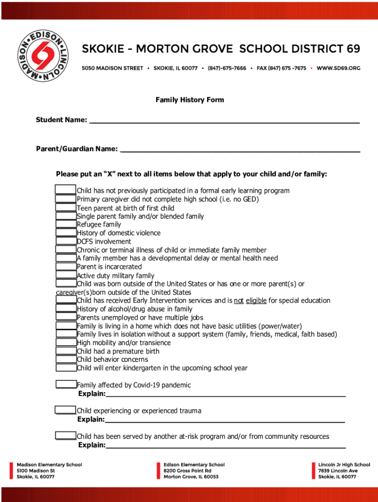 Family History Form Student Name: ___Parent/Guardian Name: ___ Please put an X next to all items below that apply to your child and/or family: Child has not previously participated in a formal early