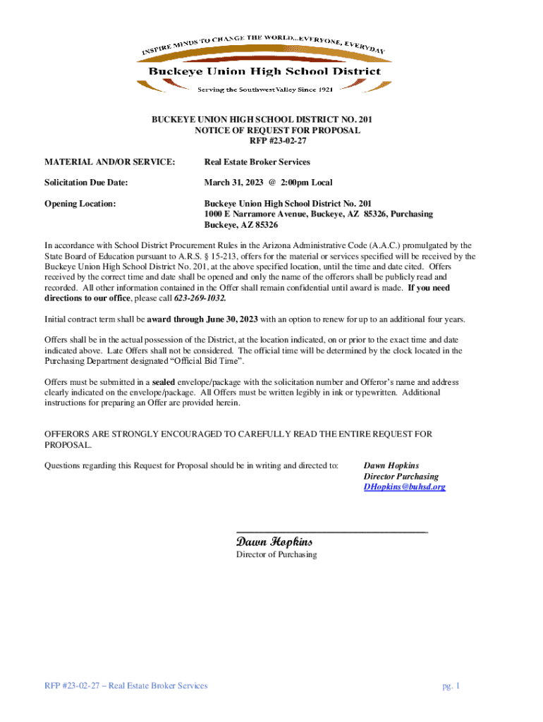 BUCKEYE UNION HIGH SCHOOL DISTRICT NO. 201 NOTICE OF REQUEST FOR PROPOSAL RFP #230227 MATERIAL AND/OR SERVICE:Real Estate Broker ServicesSolicitation Due Date:March 31, 2023 @ 2:00pm LocalOpening