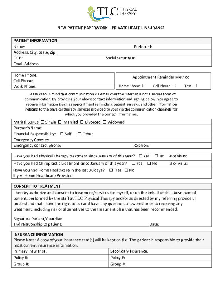 NEW PATIENT PAPERWORK PRIVATE HEALTH INSURANCE PATIENT INFORMATION Name: Address, City, State, Zip: DOB: Email Address: Home Phone: Cell Phone: Work Phone:Preferred: Social security #:Appointment