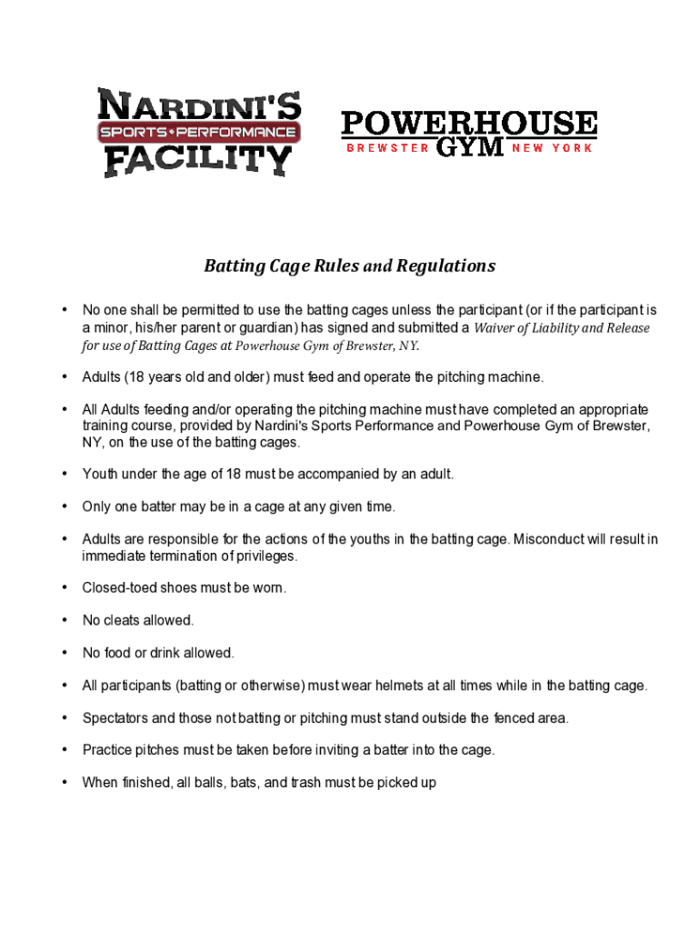 BattingCageRulesandRegulations No one shall be permitted to use the batting cages unless the participant (or if the participant is a minor, his/her parent or guardian) has signed and submitted a WaiverofLiabilityandRelease