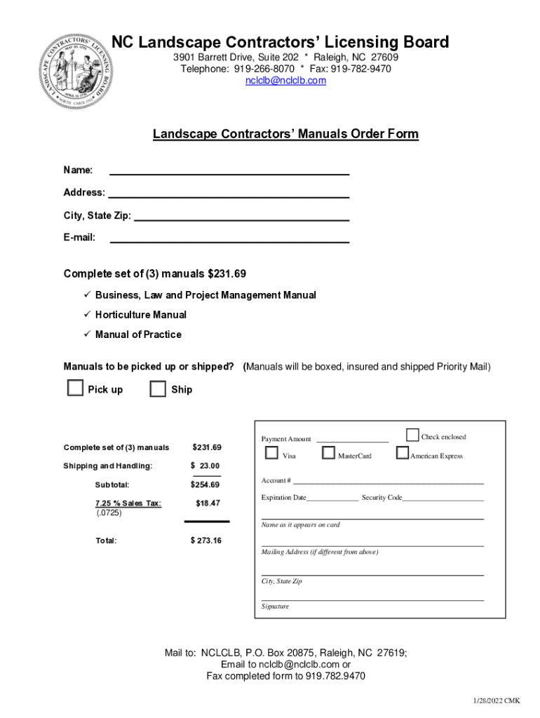NC Landscape Contractors Licensing Board 3901 Barrett Drive, Suite 202 * Raleigh, NC 27609 Telephone: 9192668070 * Fax: 9197829470 nclclb@nclclb.comLandscape Contractors Manuals Order Form Name: Address: