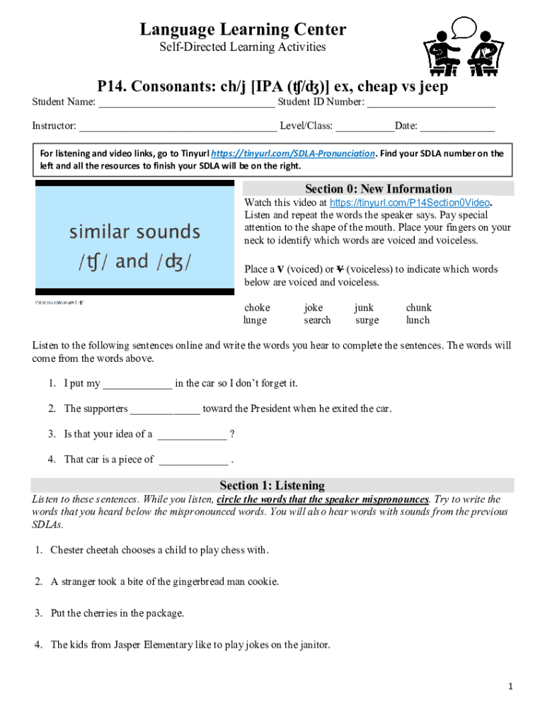 Language Learning Center Self-directed Learning ActivitiesP14. Consonants: ch/j [IPA (/)] ex, cheap vs jeepStudent Name: ___ Student ID Number: ___ Instructor: ___ Level/Class: ___Date: ___ For listening