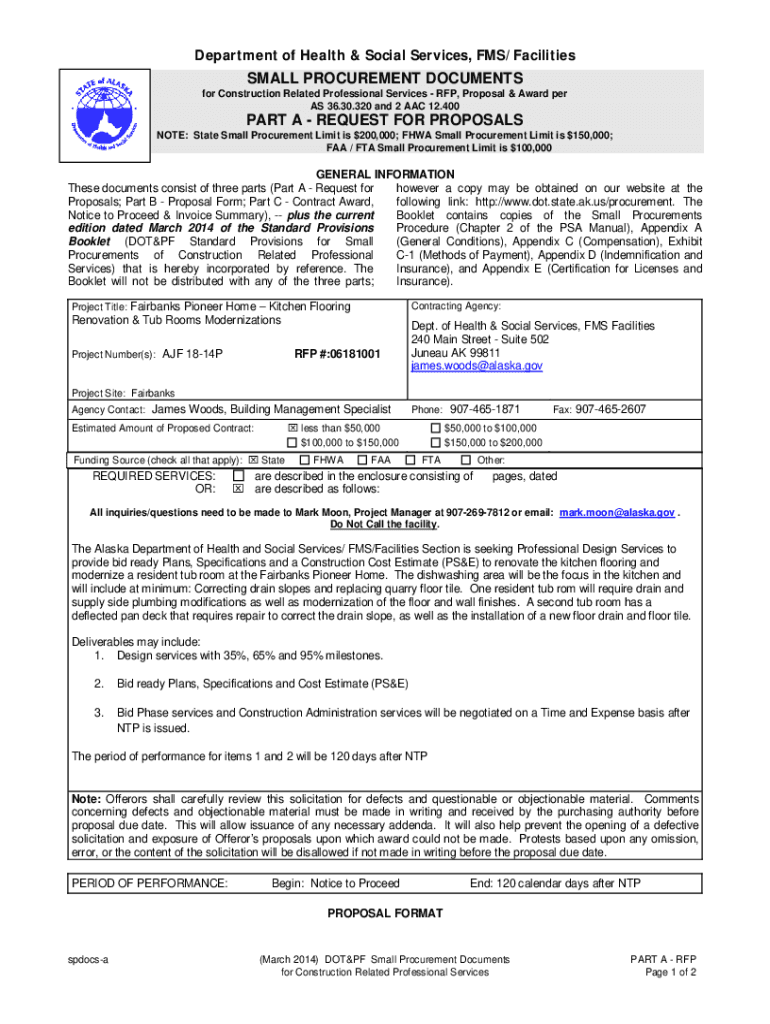 Department of Health & Social Services, FMS/FacilitiesSMALL PROCUREMENT DOCUMENTS for Construction Related Professional Services RFP, Proposal & Award per AS 36.30.320 and 2 AAC 12.400PART A REQUEST