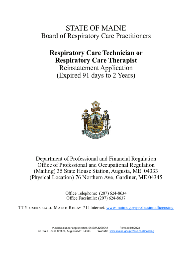 STATE OF Inboard of Respiratory Care Practitioners Respiratory Care Technician or Respiratory Care Therapist Reinstatement Application (Expired 91 days to 2 Years)Department of Professional and Financial