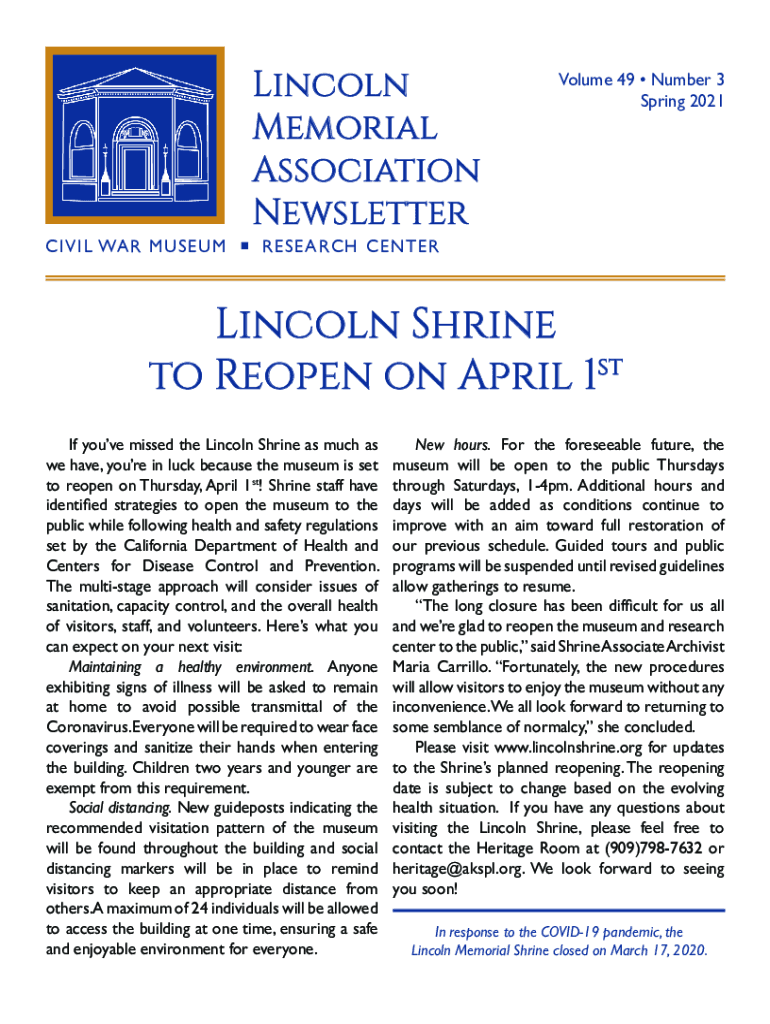 Lincoln Memorial Association NewsletterVolume 49 Number 3 Spring 2021Civil War Museum Research Center Lincoln Shrine to Reopen on April 1st If you've missed the Lincoln Shrine as much as we have,