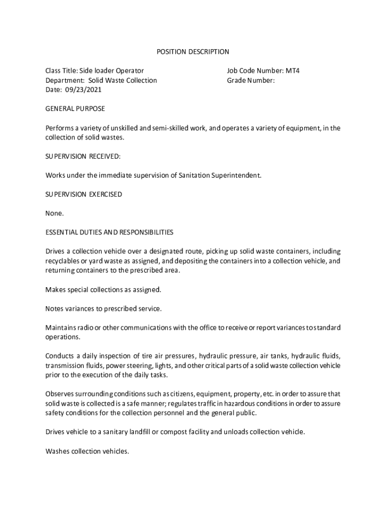 POSITION DESCRIPTION Class Title: Side loader Operator Department: Solid Waste Collection Date: 09/23/2021Job Code Number: MT4 Grade Number:GENERAL PURPOSE Performs a variety of unskilled and semiskilled