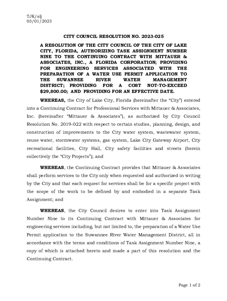 TJK/ALJ 03/01/2023CITY COUNCIL RESOLUTION NO. 2023025 A RESOLUTION OF THE CITY COUNCIL OF THE CITY OF LAKE CITY, FLORIDA, AUTHORIZING TASK ASSIGNMENT NUMBER NINE TO THE CONTINUING CONTRACT WITH MATTER