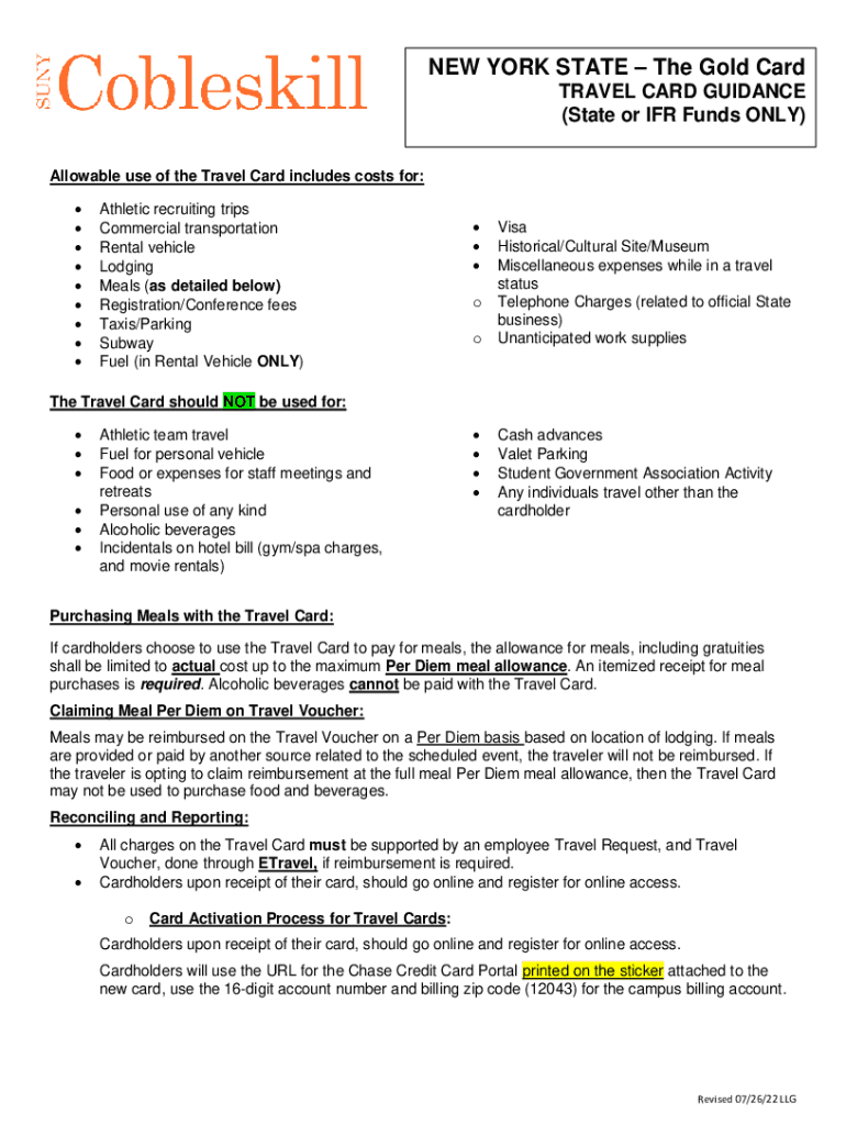 NEW YORK STATE The Gold Card TRAVEL CARD GUIDANCE (State or IFR Funds ONLY) Allowable use of the Travel Card includes costs for: Athletic recruiting trips Commercial transportation Rental vehicle