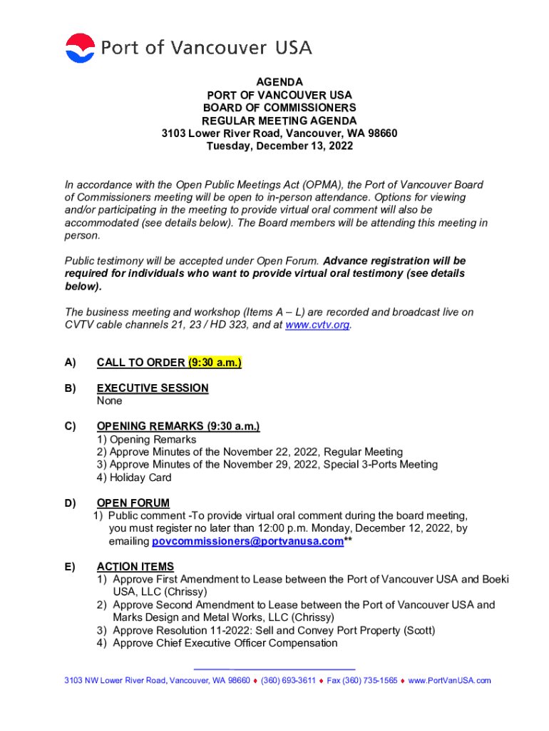 AGENDA PORT OF VANCOUVER USA BOARD OF COMMISSIONERS REGULAR MEETING AGENDA 3103 Lower River Road, Vancouver, WA 98660 Tuesday, December 13, 2022, In accordance with the Open Public Meetings Act (OMA),
