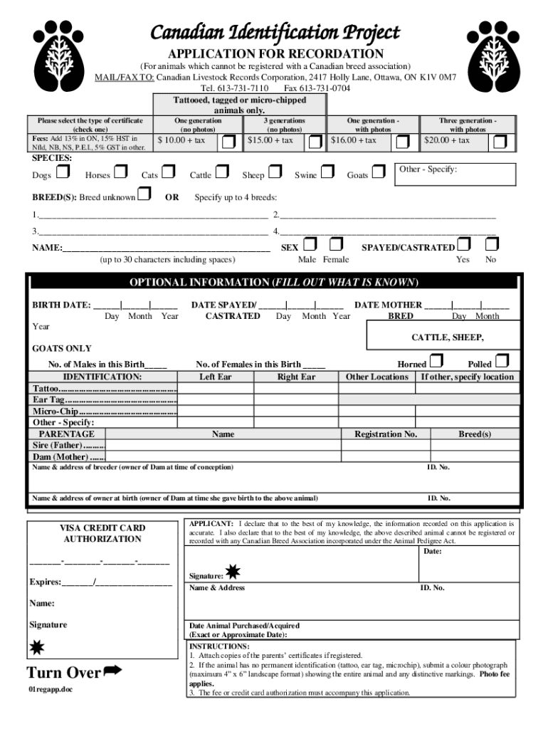 Canadian Identification Project APPLICATION FOR DECORATION (For animals which cannot be registered with a Canadian breed association) MAIL/FAX TO: Canadian Livestock Records Corporation, 2417 Holly