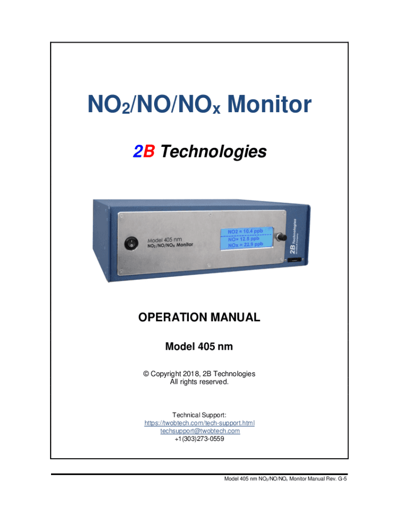 NO2/NO/NOX Monitor 2B TechnologiesOPERATION MANUAL Model 405 nm Copyright 2018, 2B Technologies All rights reserved. Technical Support: https://twobtech.com/techsupport.html techsupport@twobtech.com