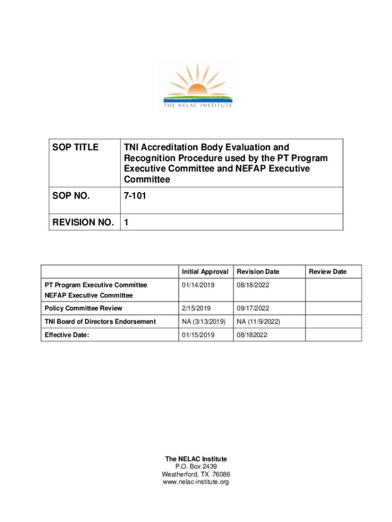 SOP TITLE:SOP NO.: SOP NO.TNA Accreditation Body Evaluation and Format Guidelines for Standard Operating Recognition Procedure used by the PT Program Procedures (SOPS) of The CELAC Institute Executive
