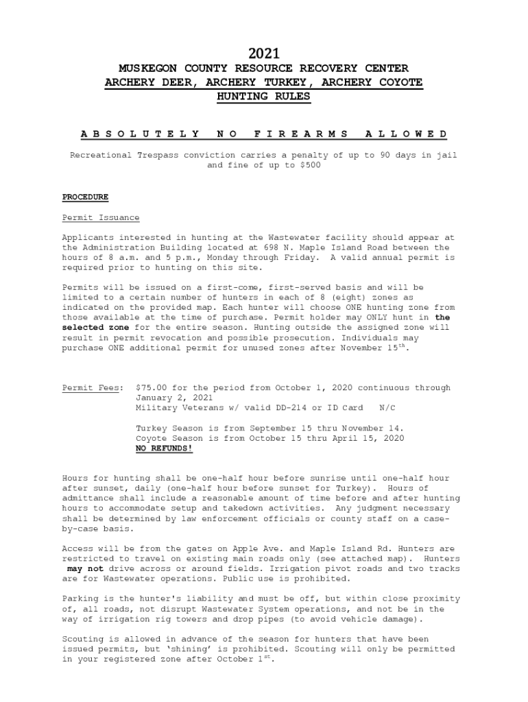 2021 MUSKEGON COUNTY RESOURCE RECOVERY CENTER ARCHERY DEER, ARCHERY TURKEY, ARCHERY COYOTE HUNTING RULES A B S O L U T E L IN OF I R E A R M SA L O W E DRecreational Trespass conviction carries a