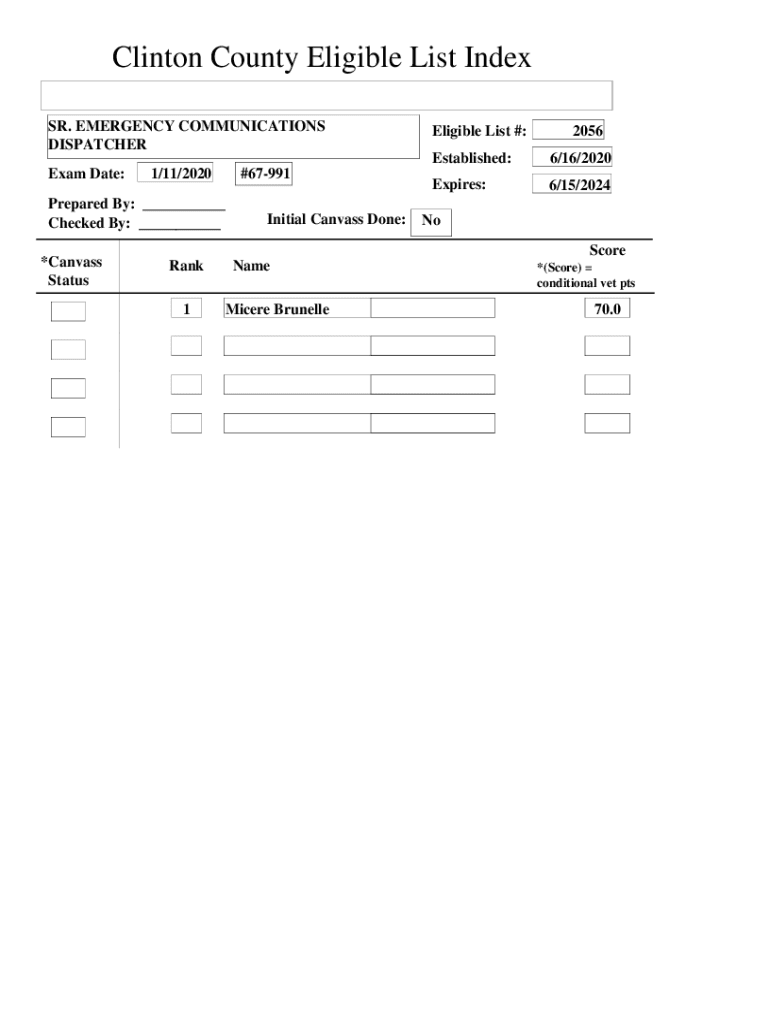 Clinton County Eligible List Index SR. EMERGENCY COMMUNICATIONS DISPATCHER Exam Date:1/11/2020Prepared By: ___ Checked By: ___ *Canvass Status#67991 Initial Canvass Done:Eligible List #:2056Established:6/16/2020Expires:6/15/2024No