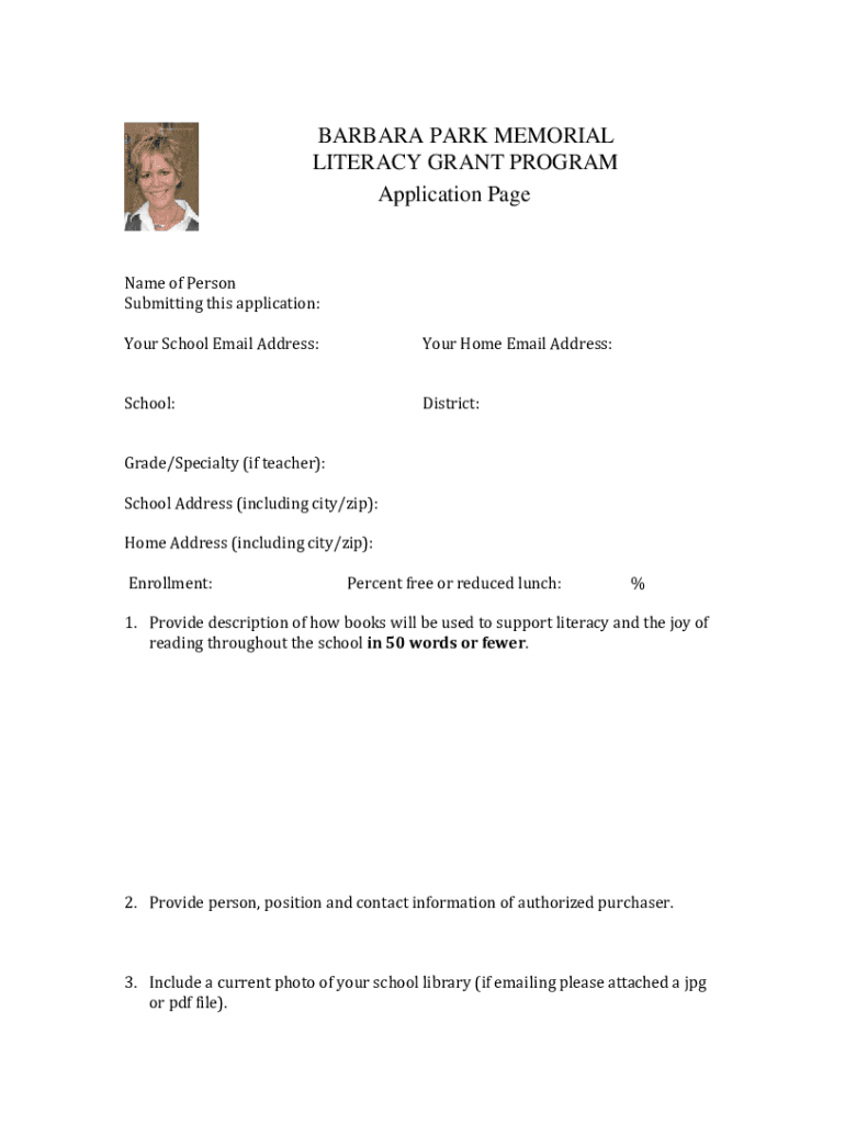 BARBARA PARK MEMORIAL LITERACY GRANT PROGRAM Application We are pleased to invite all AZ schools to apply for the Barbara Park Memorial Literacy Grant program! Mission Statement: To award grants up