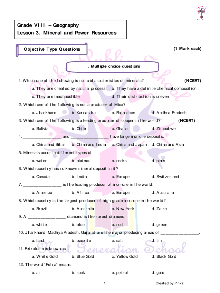 Grade VIII Geography Lesson 3. Mineral and Power Resources (1 Mark each)Objective Type Questions. Multiple choice questions1. Which one of the following is not a characteristic of minerals?(CERT)a.