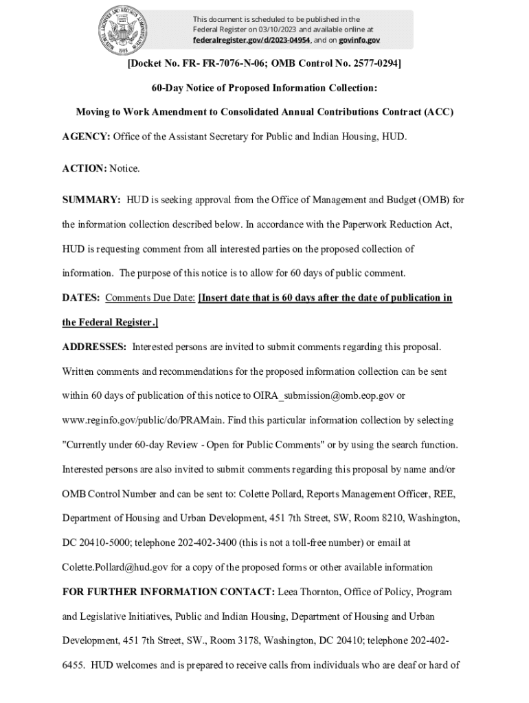 This document is scheduled to be published in the Federal Register on 03/10/2023 and available online at DEPARTMENTfederalregister.gov/d/202304954, OF HOUSING AND URBAN DEVELOPMENT and on gov info.gov[Docket