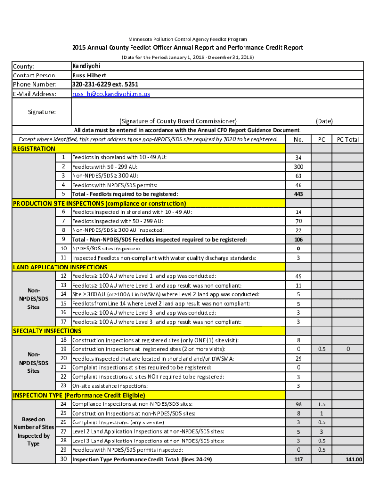 Minnesota Pollution Control Agency Feedlot Program2015 Annual County Feedlot Officer Annual Report and Performance Credit Report (Data for the Period: January 1, 2015, December 31, 2015)Kandiyohi