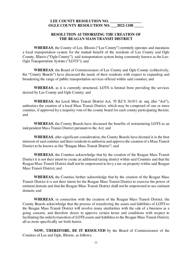 LEE COUNTY RESOLUTION NO. ___ OGLE COUNTY RESOLUTION NO. ___20221108 ___ RESOLUTION AUTHORIZING THE CREATION OF THE REAGAN MASS TRANSIT DISTRICT WHEREAS, the County of Lee, Illinois (Lee County) currently