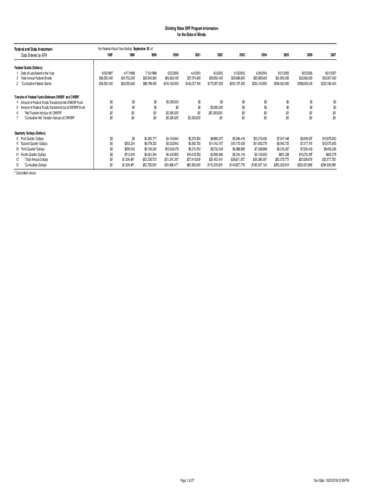 Drinking Water SRF Program Information for the State of Illinois Federal and State Investment Data Entered by EPA Federal Grants (Dollars) 1 Date of Last Award in the Year 2 Total Annual Federal Grants