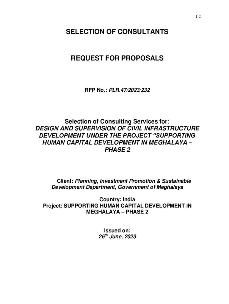 12SELECTION OF CONSULTANTSREQUEST FOR PROPOSALS RFP No.: PLR.47/2023/232Selection of Consulting Services for: DESIGN AND SUPERVISION OF CIVIL INFRASTRUCTURE DEVELOPMENT UNDER THE PROJECT SUPPORTING