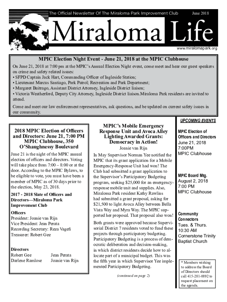 June 2018The Official Newsletter Of The Diploma Park Improvement ClubMiraloma Lifeway.miralomapark. Olympic Election Night Event June 21, 2018, at the EPIC Clubhouse