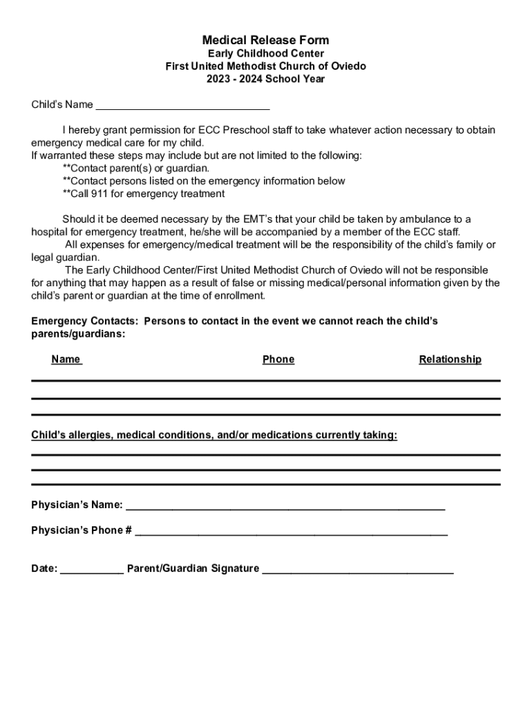 Medical Release Form Early Childhood Center First United Methodist Church of Oviedo 2023 2024 School Year Child's Name ___ I hereby grant permission for ECC Preschool staff to take whatever action