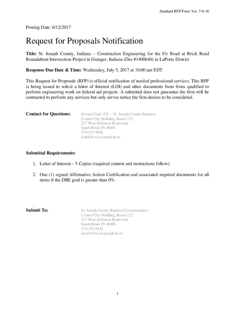 Standard RFP Form Very. 7816Posting Date: 6/12/2017Request for Proposals Notification Title: St. Joseph County, Indiana Construction Engineering for the Fir Road at Brick Road Roundabout Intersection