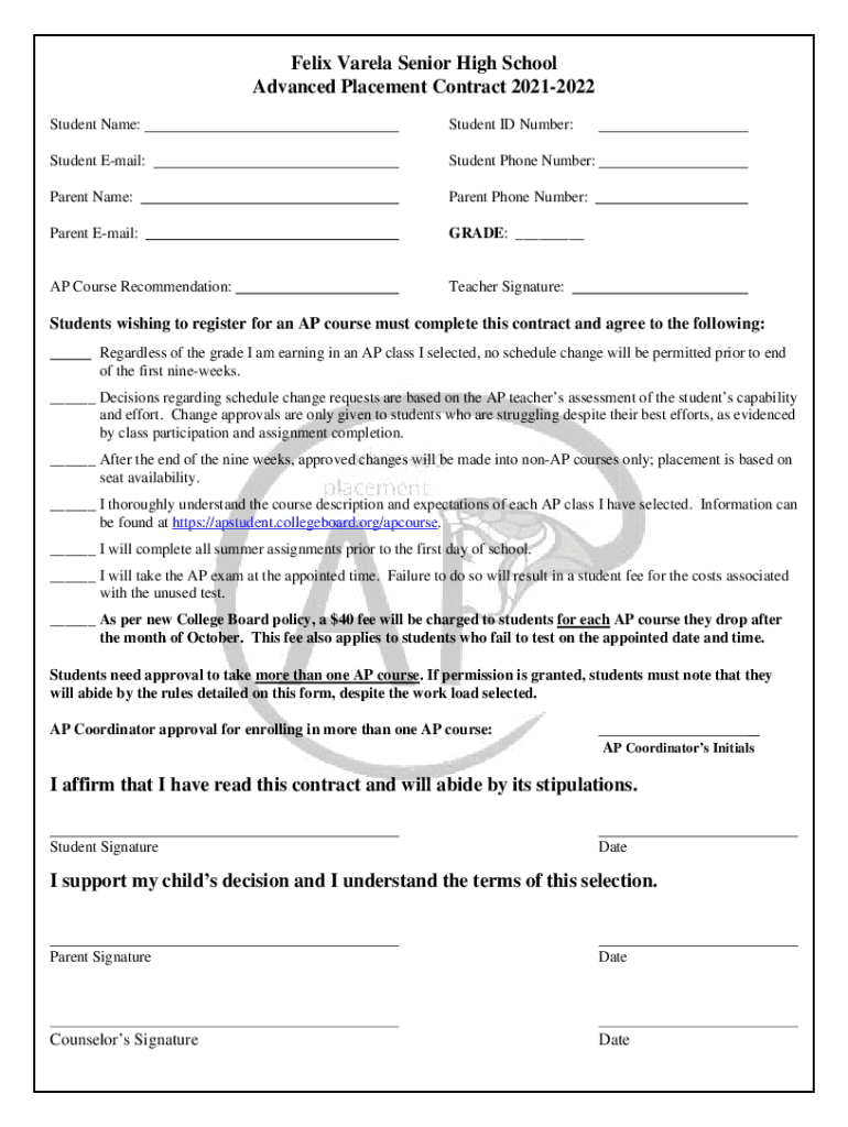 Felix Varela Senior High School Advanced Placement Contract 20212022 Student Name:Student ID Number:Student Email:Student Phone Number:Parent Name:Parent Phone Number:Parent Email:GRADE: ___AP Course