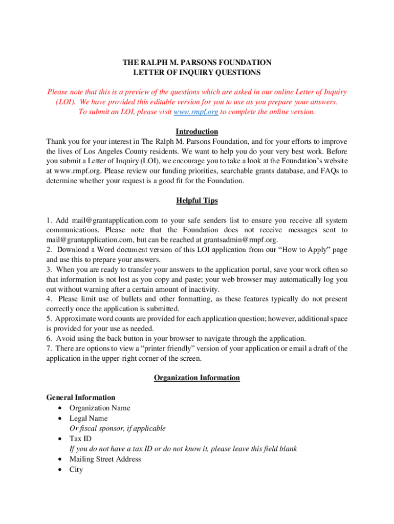 THE RALPH M. PARSONS FOUNDATION LETTER OF INQUIRY QUESTIONS Please note that this is a preview of the questions which are asked in our online Letter of Inquiry (LOI). We have provided this editable