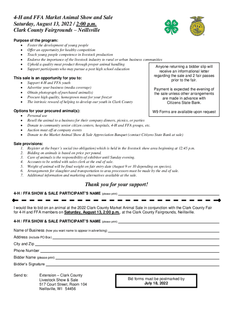 4H and FFA Market Animal Show and Sale Saturday, August 13, 2022 / 2:00 p.m. Clark County Fairgrounds Nashville Purpose of the program: Foster the development of young people Offer an opportunity