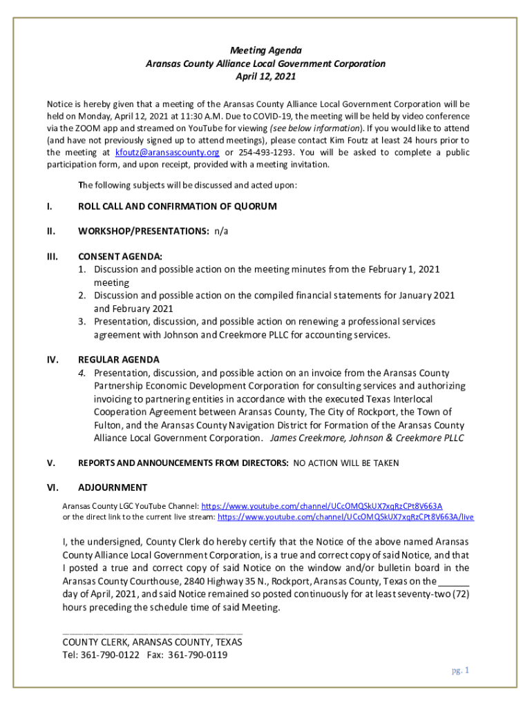 Meeting Agenda Arkansas County Alliance Local Government Corporation April 12, 2021, Notice is hereby given that a meeting of the Arkansas County Alliance Local Government Corporation will be held