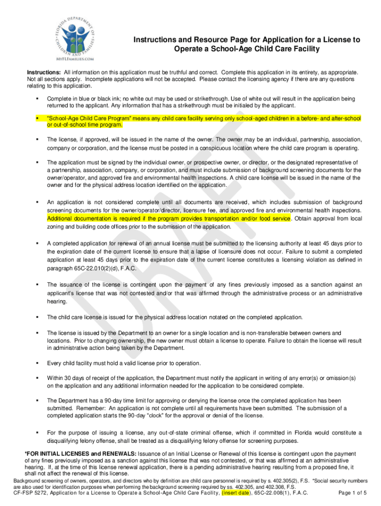 Instructions and Resource Page for Application for a License to Operate a Schoolmate Child Care Facility Instructions: All information on this application must be truthful and correct. Complete this